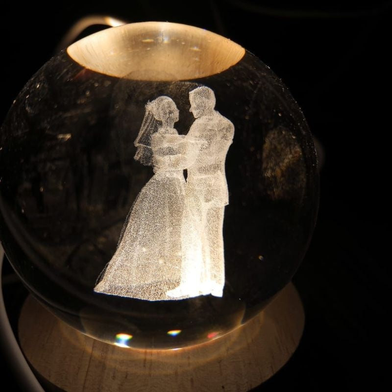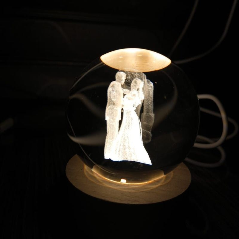 Celebrate love in its most magical form with our Personalized 3D Wedding Couple Crystal Lamp. This beautifully crafted glass orb features an intricately laser-engraved couple, illuminated from below to create a stunning 3D effect that glows with warmth and romance.